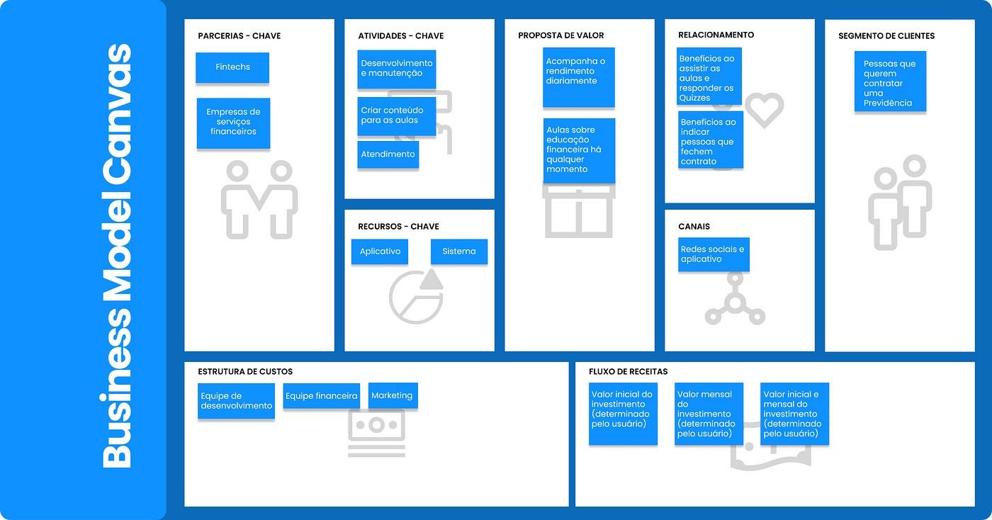 Como a modalidade de Previdência ainda não é oferecida pela fintech, nos propusemos a desenvolver tal serviço, a fim de que futuramente essa modalidade entre no mix de produtos oferecidos pela empresa.