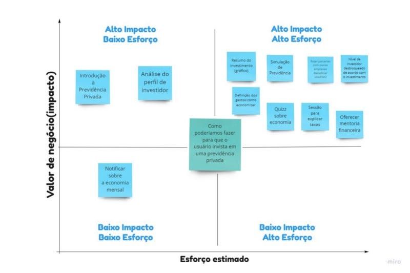 Para isso, utilizamos uma matriz de impacto x esforço para encontrar as soluções que geram maior impacto com o mínimo de esforço possível e quais seriam relevantes dentro do contexto do usuário.